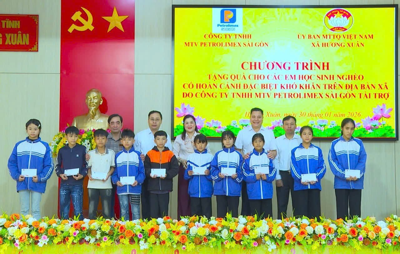 Tiếp đó, đoàn đã trao 120 suất quà cho 120 em học sinh là con em thuộc hộ nghèo, cận nghèo và có hoàn cảnh khó khăn trên địa bàn xã Hương Xuân. Mỗi suất quà trị giá 500.000 đồng, góp phần động viên, chia sẻ khó khăn, giúp các em và gia đình đón Tết thêm vui tươi, đầm ấm.