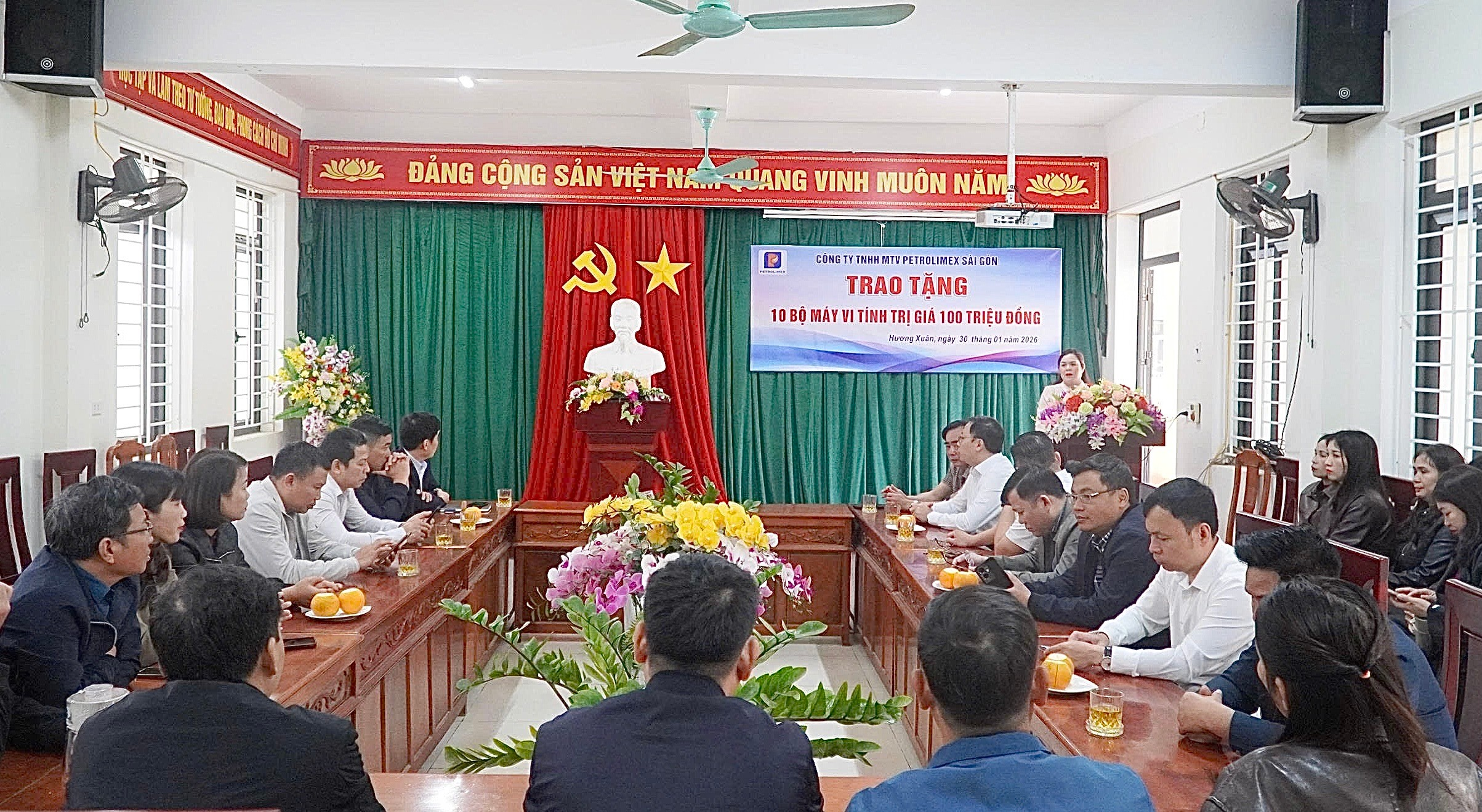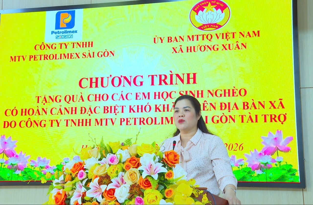 Phát biểu tại chương trình, đồng chí Trương Thị Hằng – Phó Bí thư Thường trực Đảng ủy xã Hương Xuân thay mặt lãnh đạo địa phương gửi lời cảm ơn sâu sắc tới Công ty TNHH MTV Petrolimex Sài Gòn đã luôn quan tâm, đồng hành cùng cấp ủy, chính quyền xã trong công tác an sinh xã hội thời gian qua; đồng thời mong muốn trong thời gian tới tiếp tục nhận được sự quan tâm, hỗ trợ của Công ty đối với các hoạt động nhân đạo, từ thiện tại địa phương.