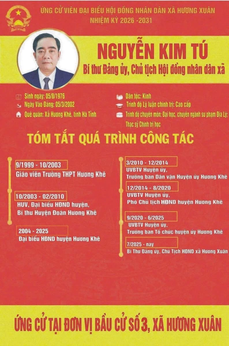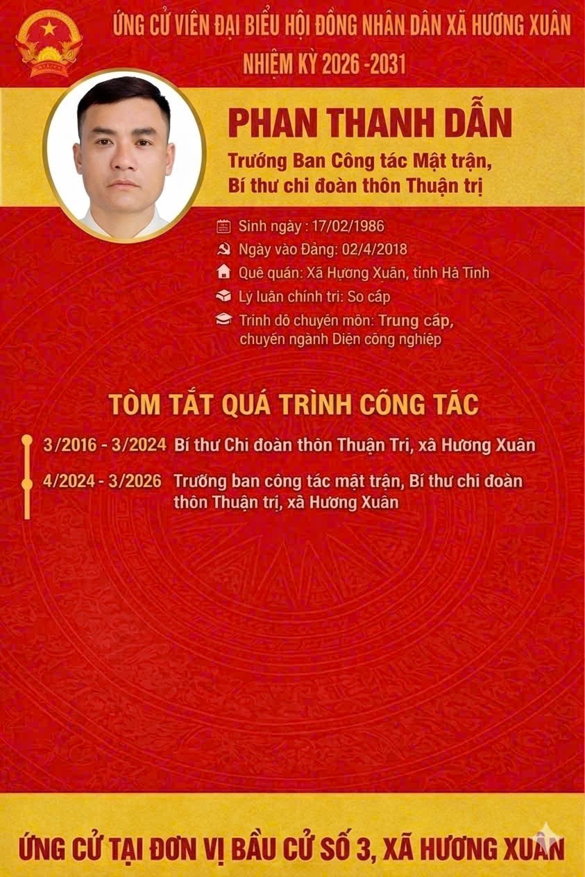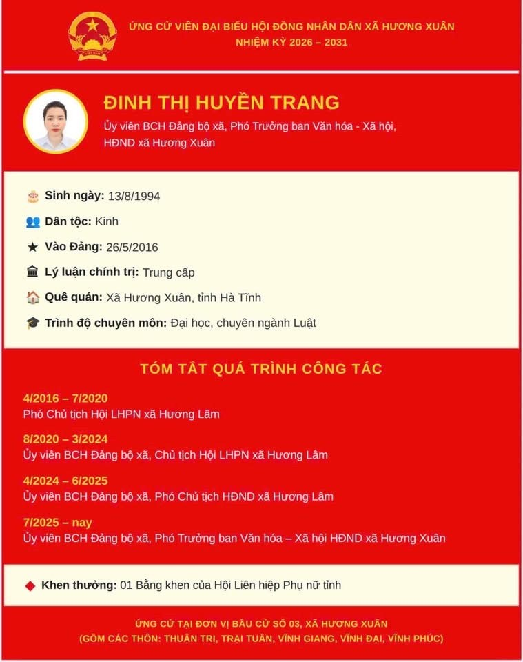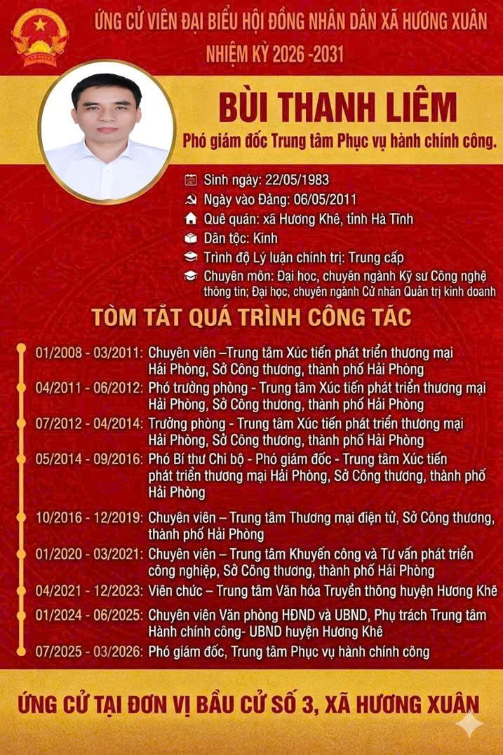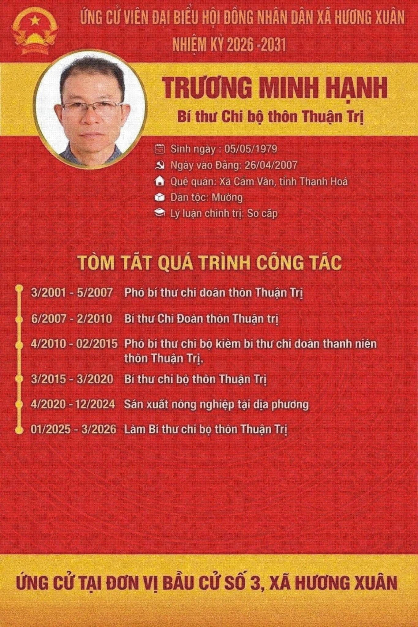 Uỷ ban bầu cử xã Hương Xuân thông báo Tiểu sử tóm tắt của các ứng cử viên đại biểu HĐND khoá XXII, nhiệm kỳ 2026-2031. (Đơn vị bầu cử số 03)