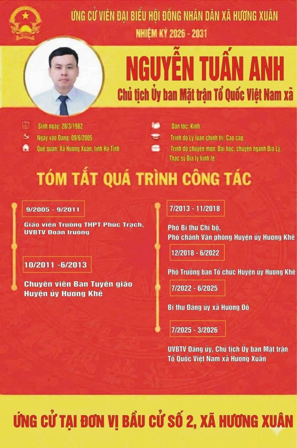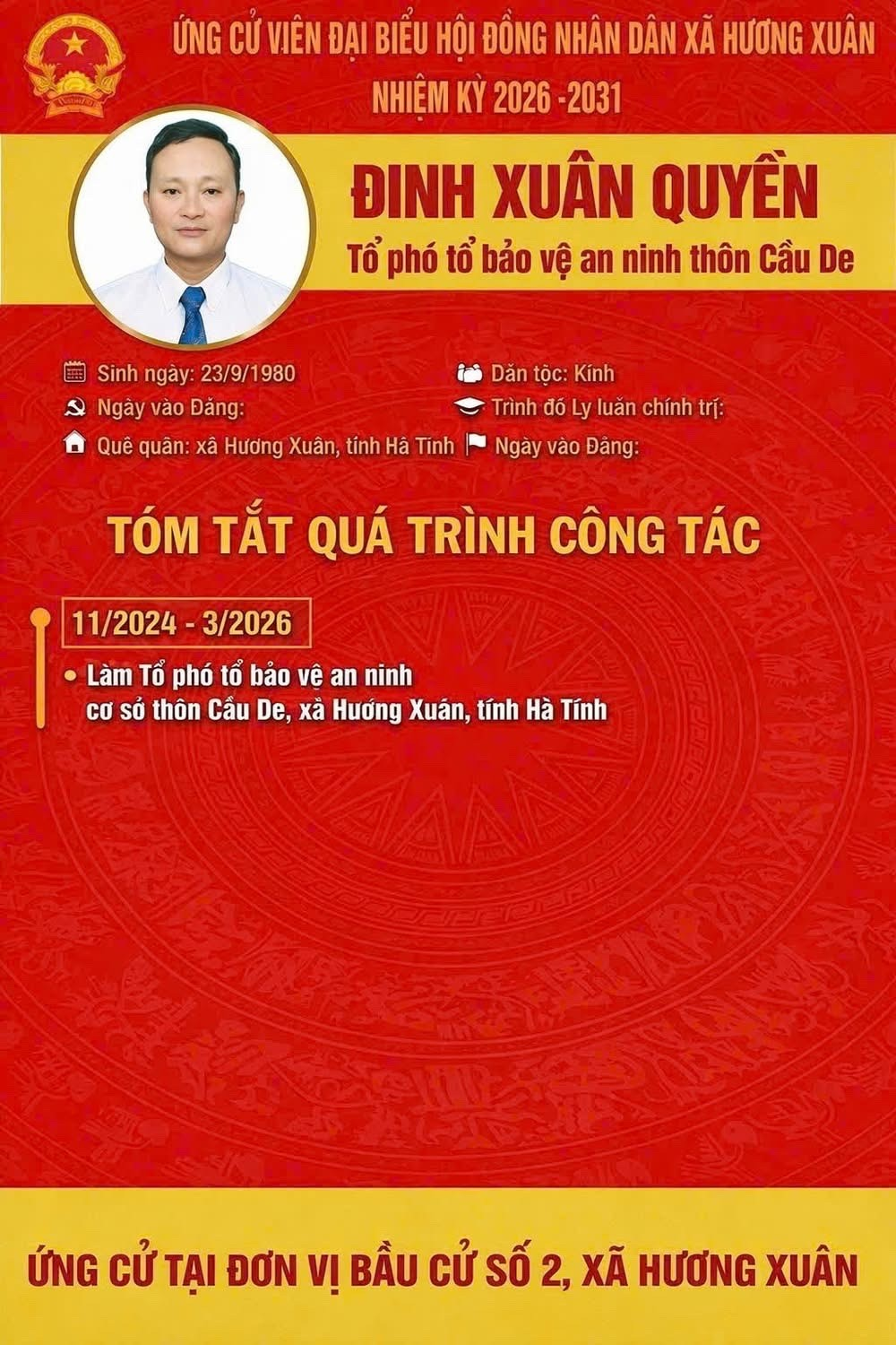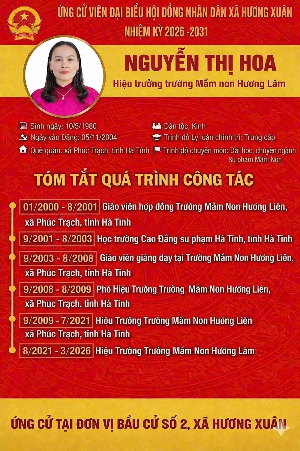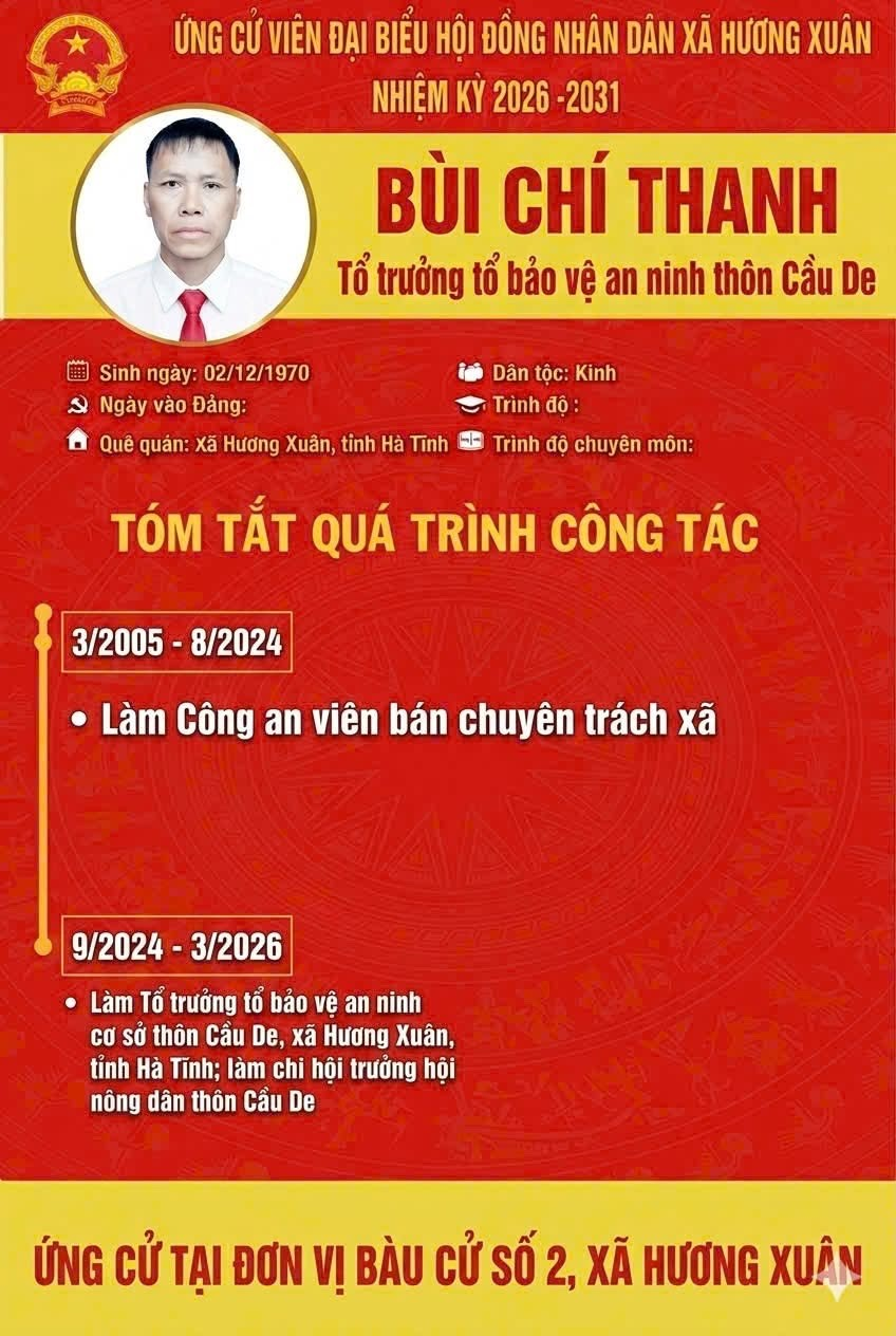 Uỷ ban bầu cử xã Hương Xuân thông báo Tiểu sử tóm tắt của các ứng cử viên đại biểu HĐND khoá XXII, nhiệm kỳ 2026-2031 ( Đơn vị bầu cử số 2)