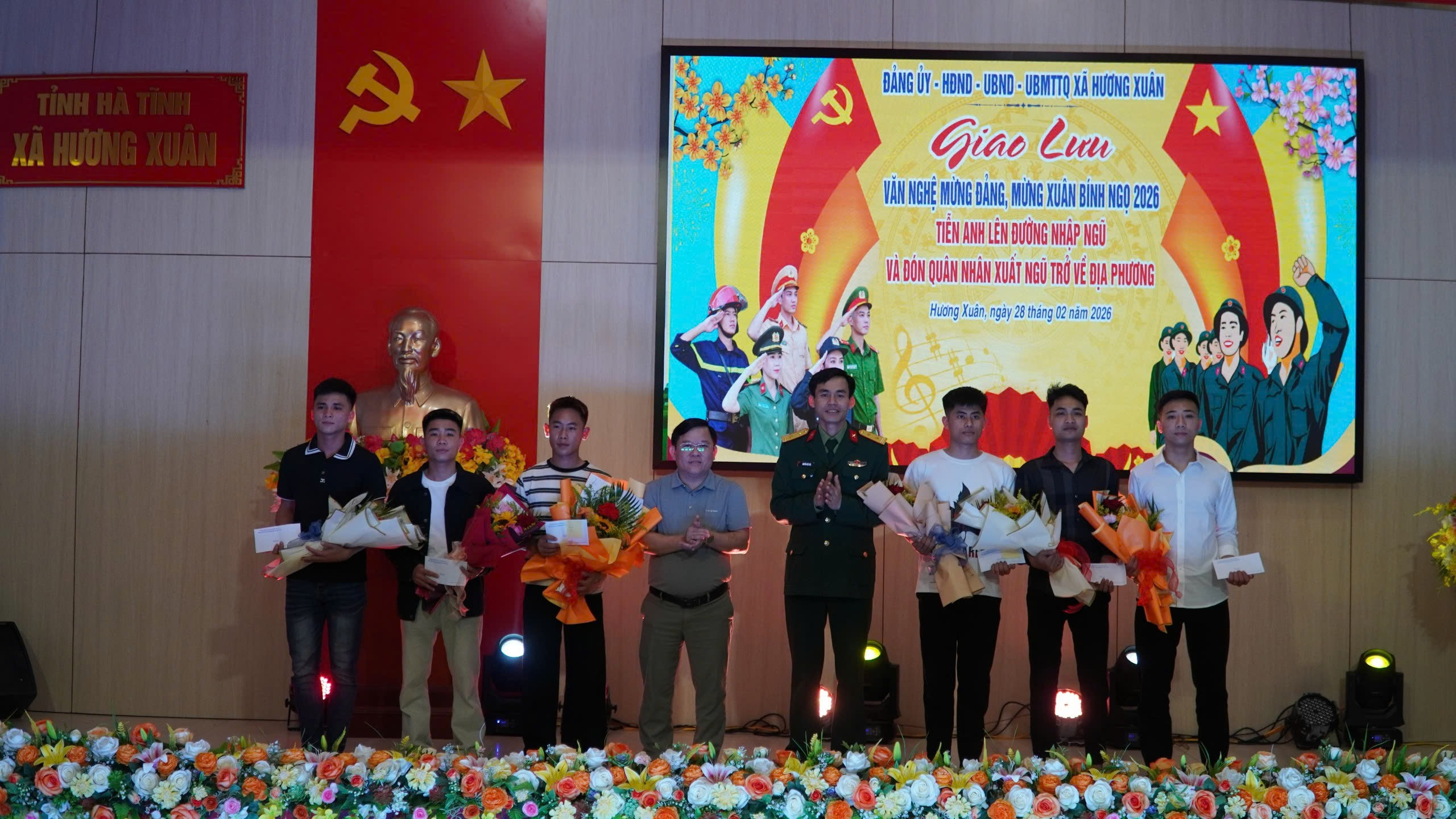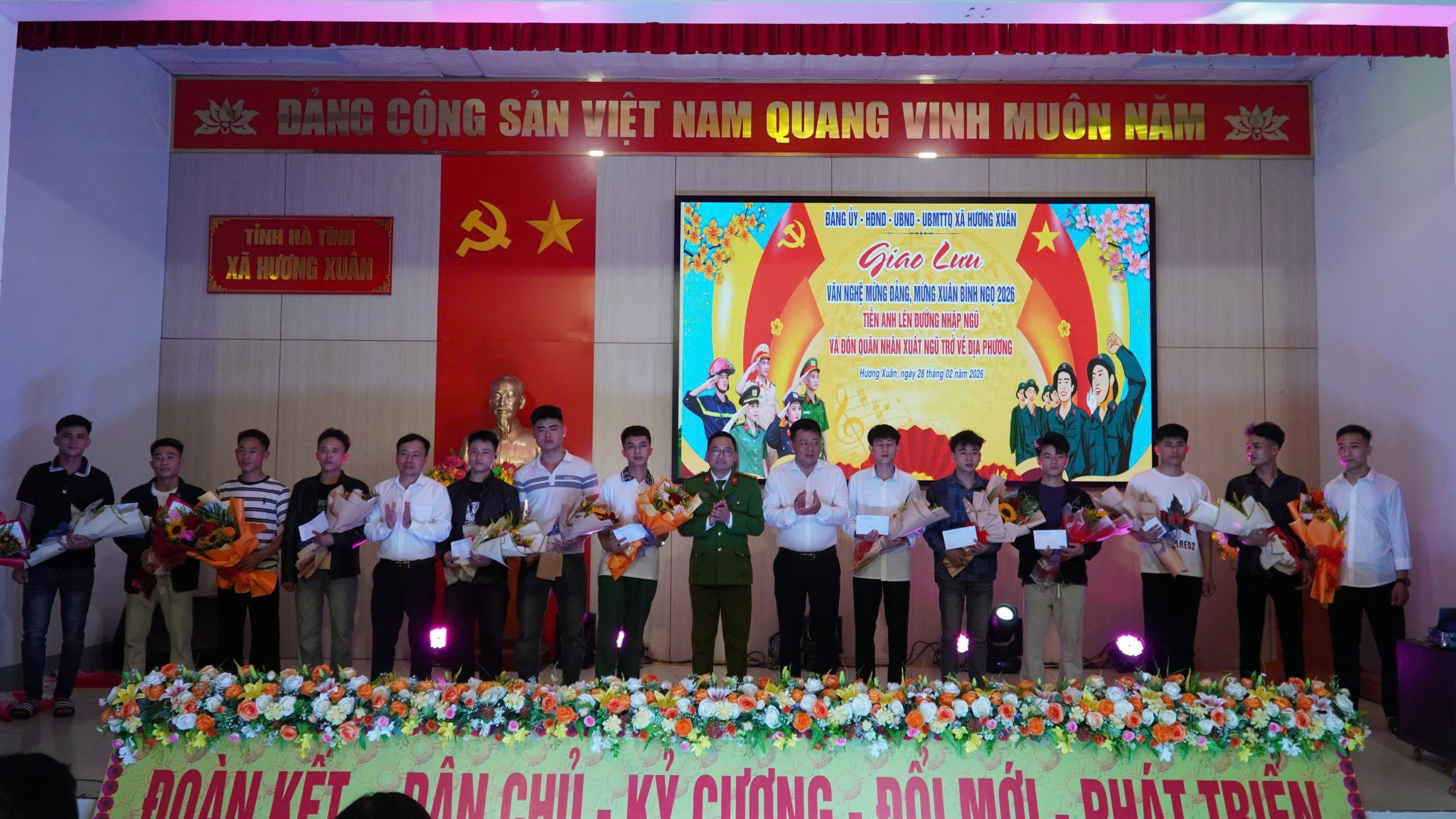 Mở đầu chương trình Đại diện Ban Thường vụ Đảng ủy, UBND, UBMTTQ và các tổ chức đoàn thể đã trao những phần quà ý nghĩa cho các công dân nhập ngũ và quân nhân hoàn thành nghĩa vụ quân sự, công an nhân dân trở về địa phương năm 2026. Đây là món quà tinh thần động viên, ghi nhận những đóng góp của các công dân đối với sự nghiệp xây dựng và bảo vệ Tổ quốc.