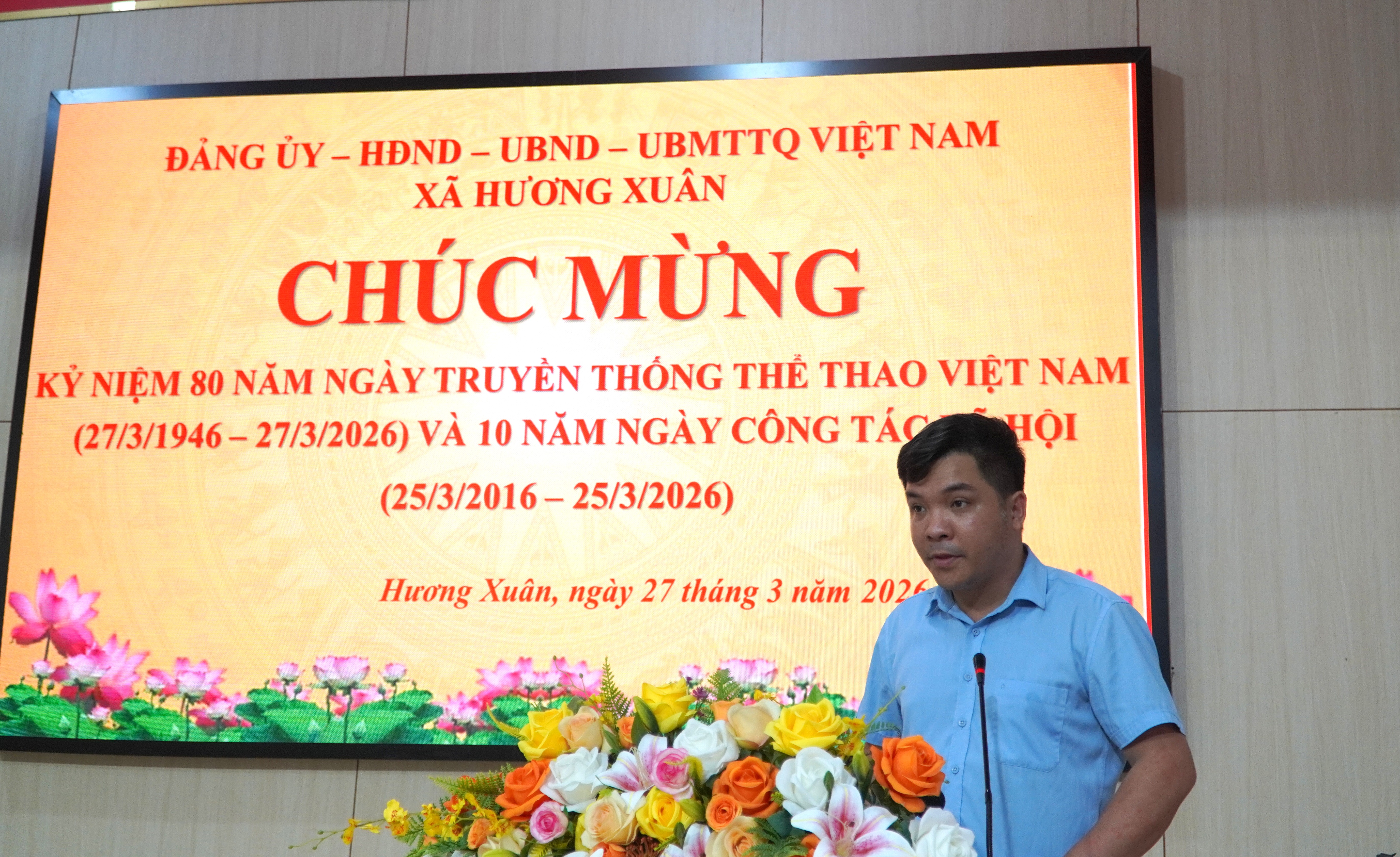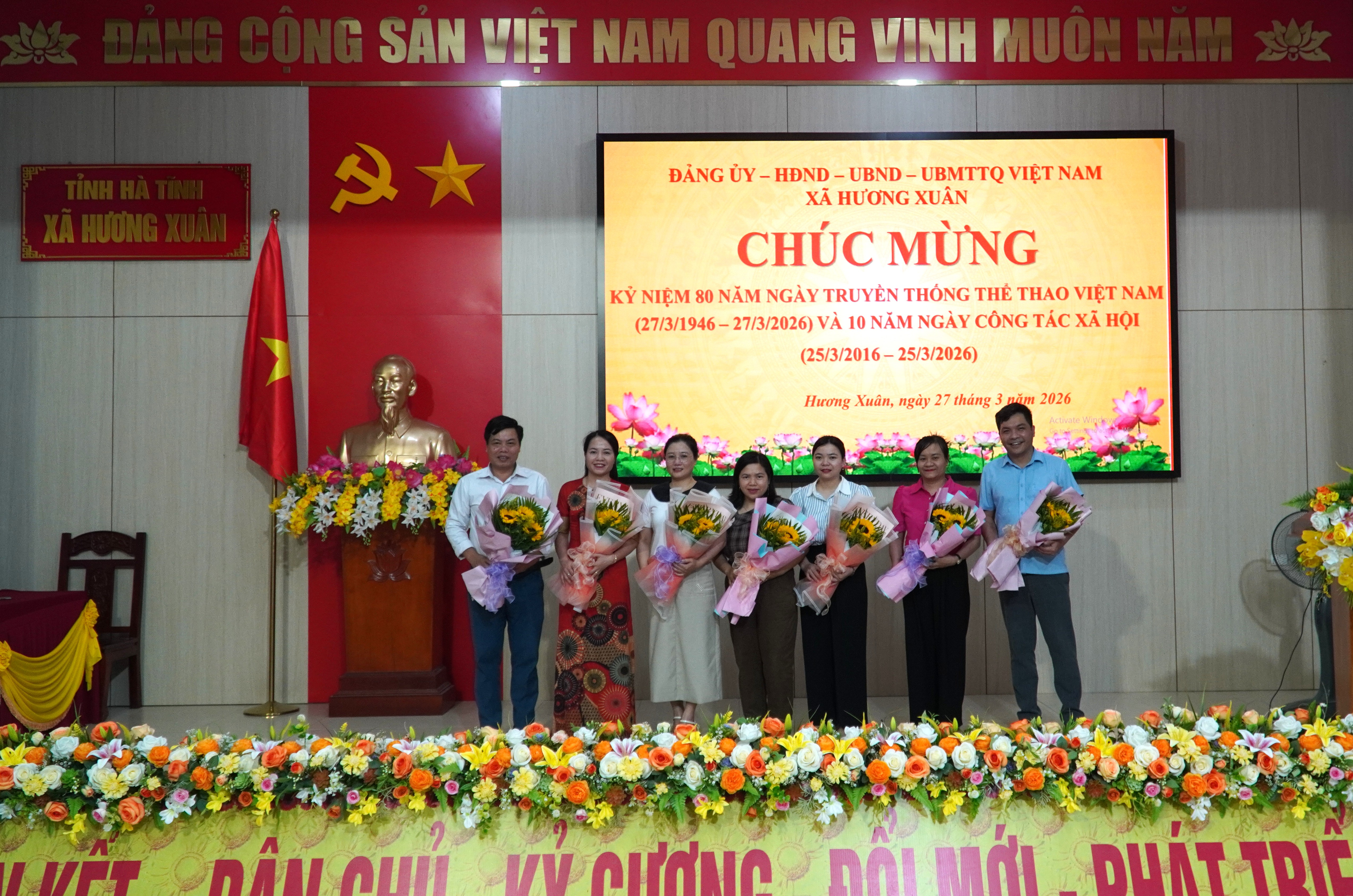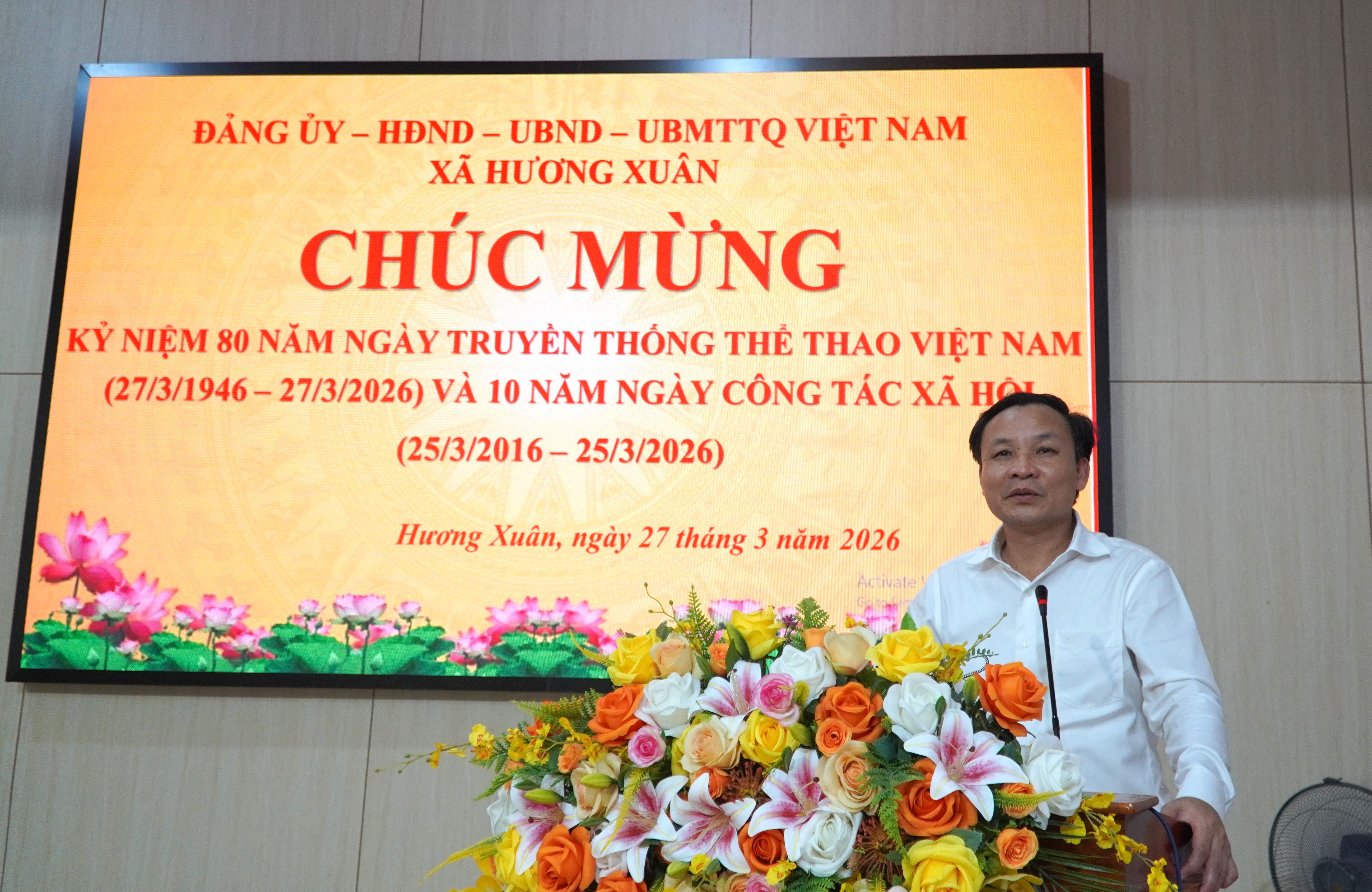 Chiều ngày 27/3/2026, xã Hương Xuân tổ chức buổi gặp mặt kỷ niệm 80 năm Ngày truyền thống Thể thao Việt Nam (27/3/1946 – 27/3/2026) và 10 năm Ngày Công tác xã hội Việt Nam (25/3/2016 – 25/3/2026) trong không khí trang trọng, ấm áp.