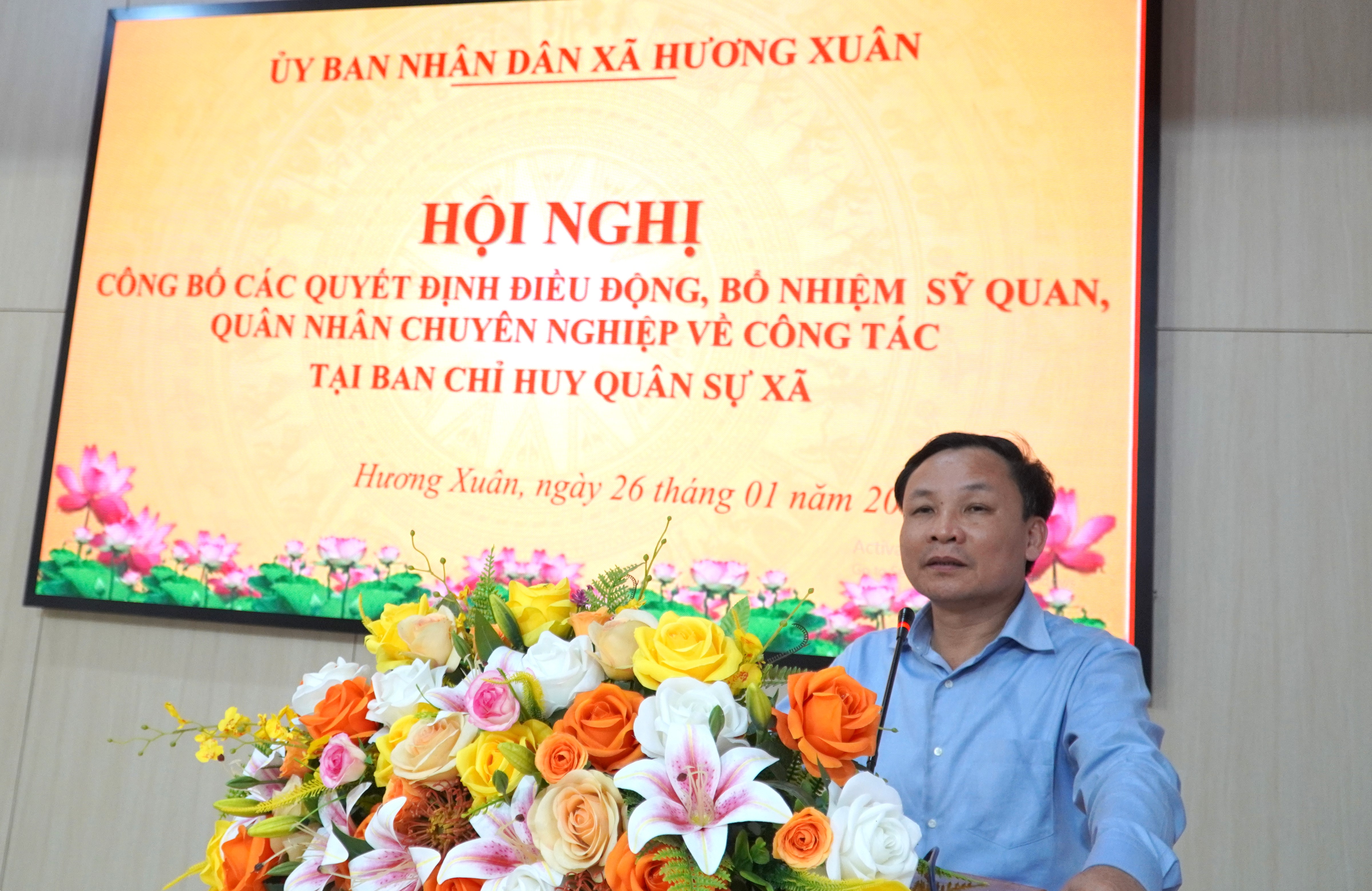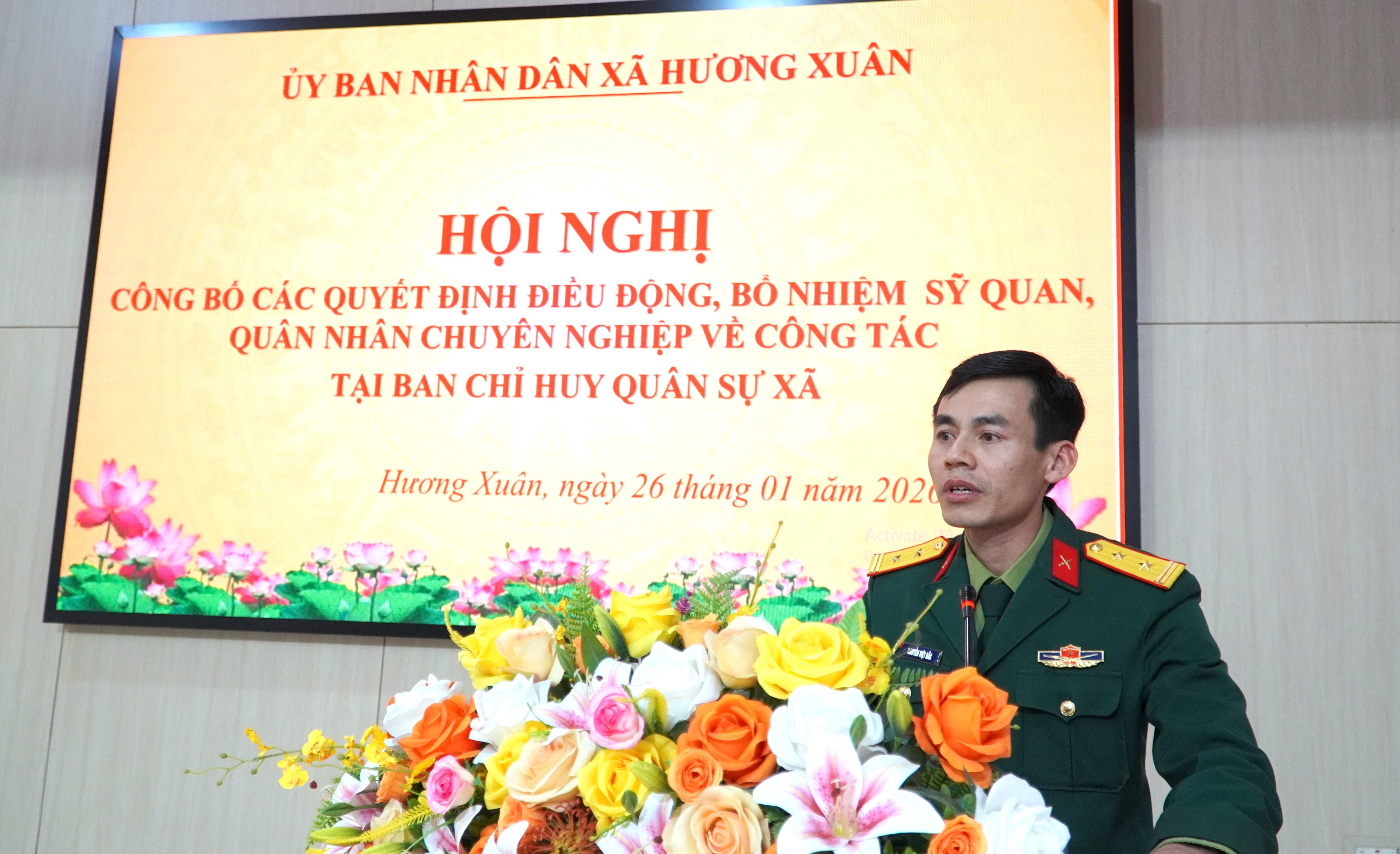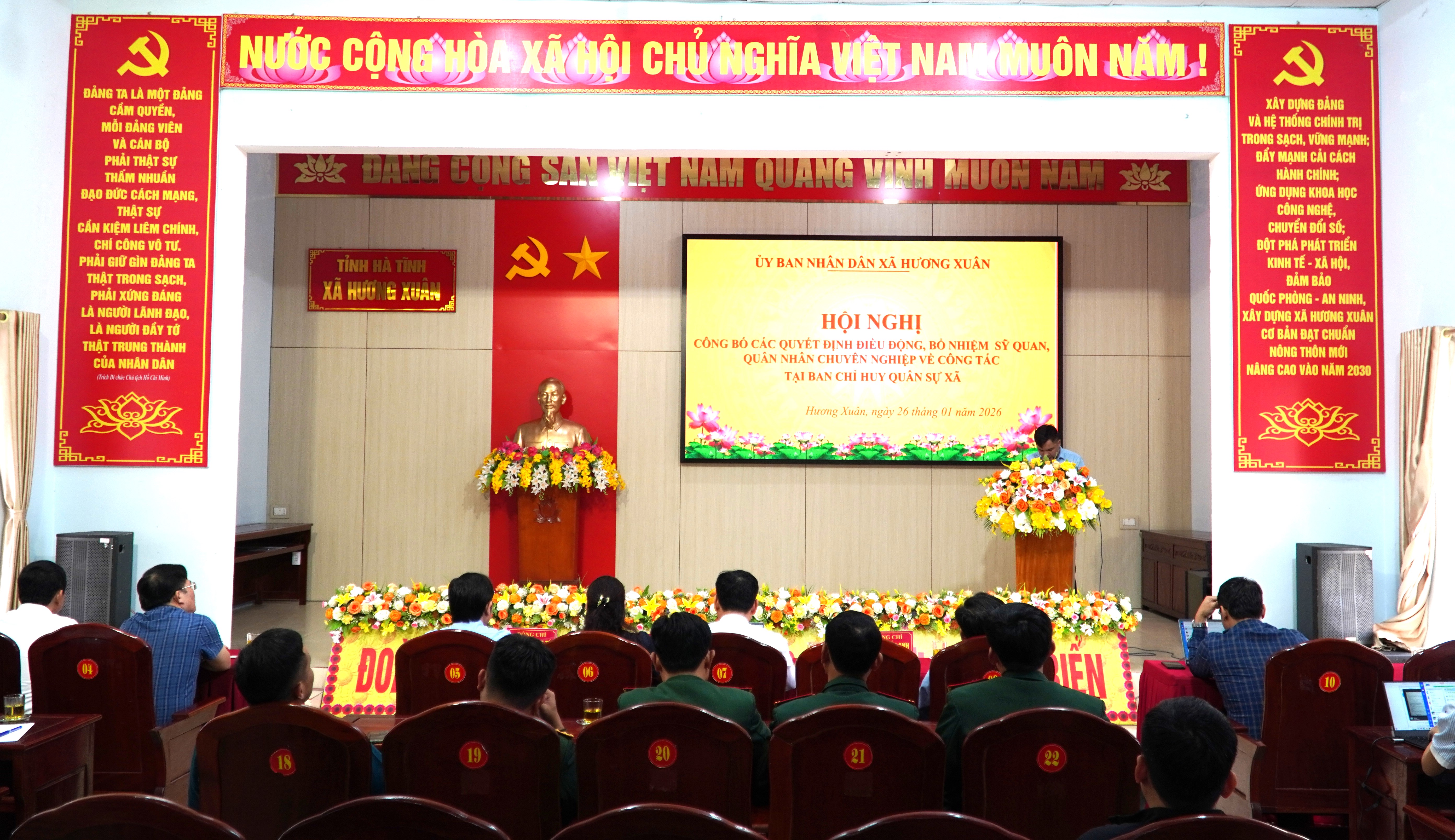 Chiều ngày 26 tháng 01 năm 2026, UBND xã Hương Xuân tổ chức Hội nghị công bố các quyết định điều động, bổ nhiệm cán bộ, sĩ quan, quân nhân chuyên nghiệp về công tác tại Ban Chỉ huy Quân sự (CHQS) xã.