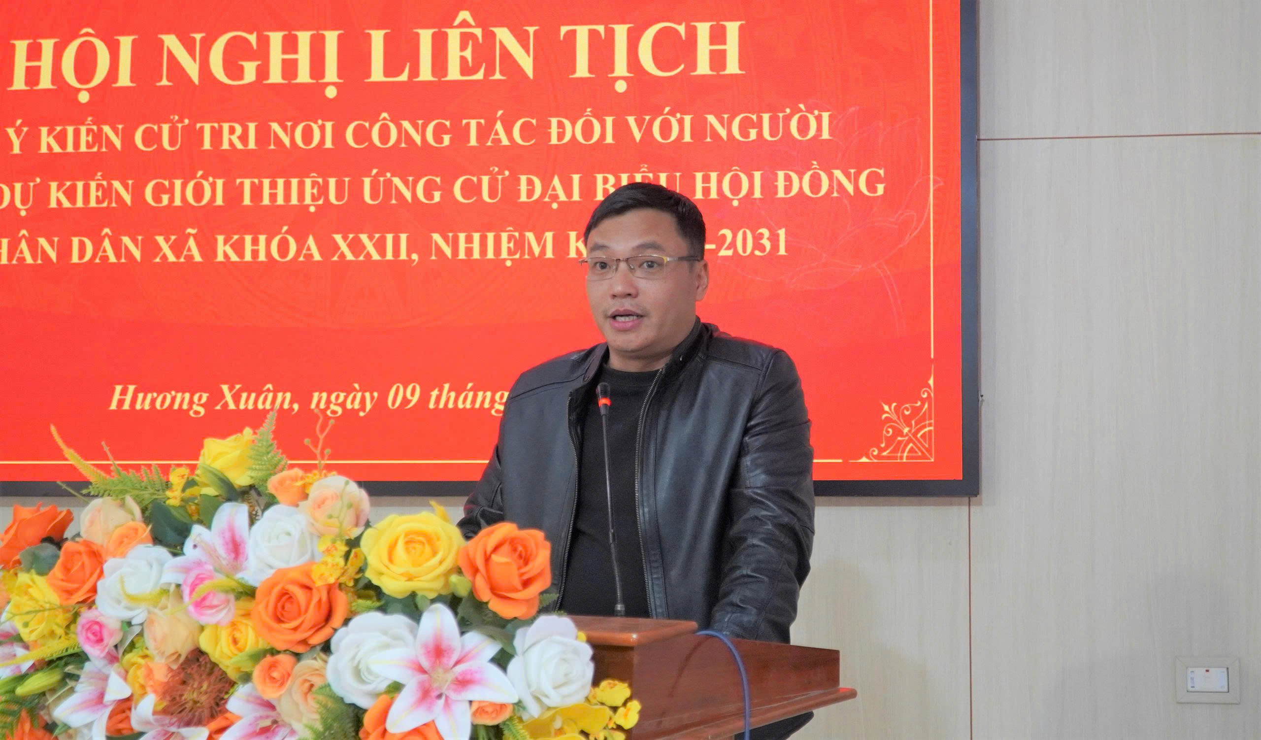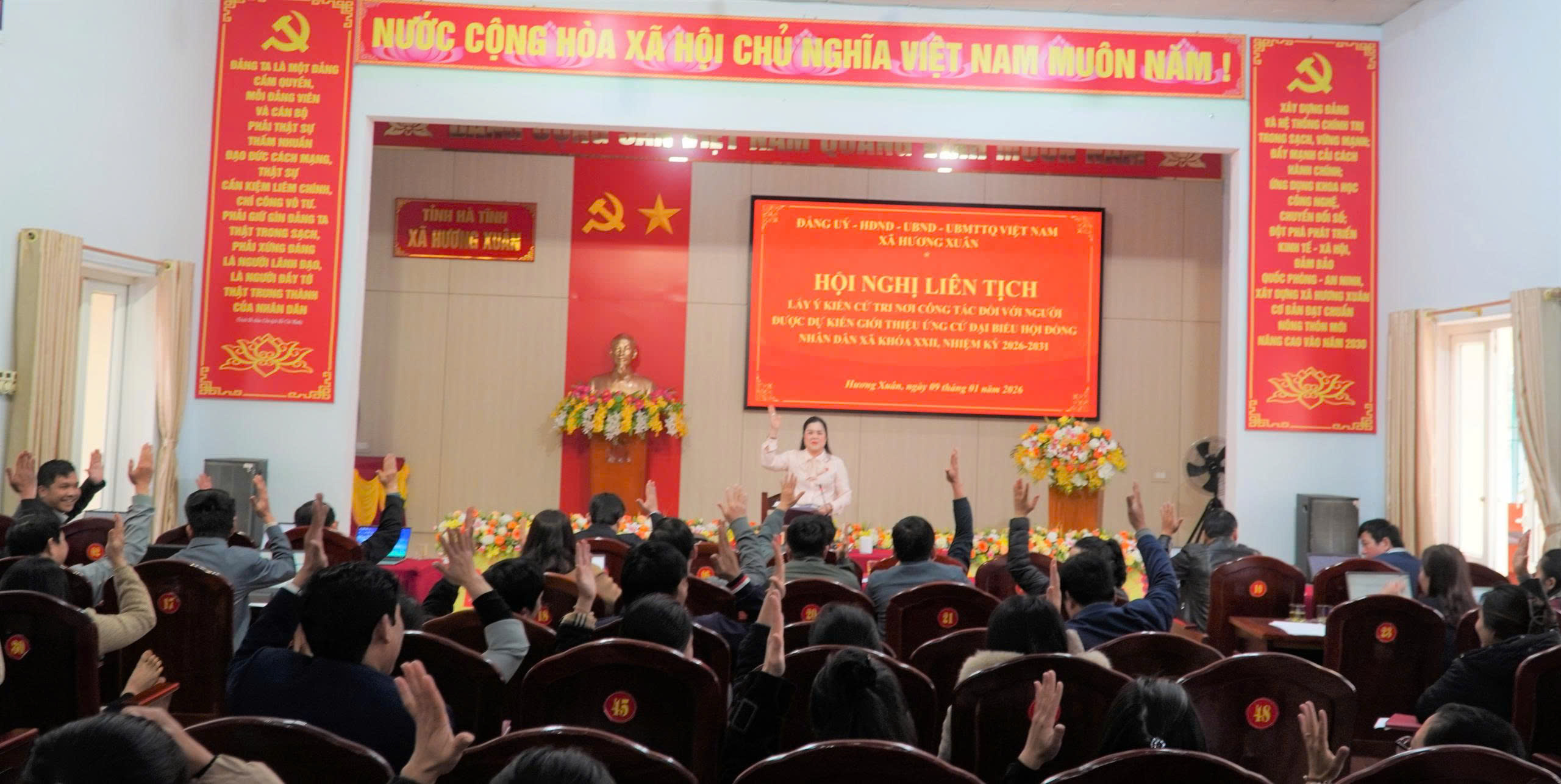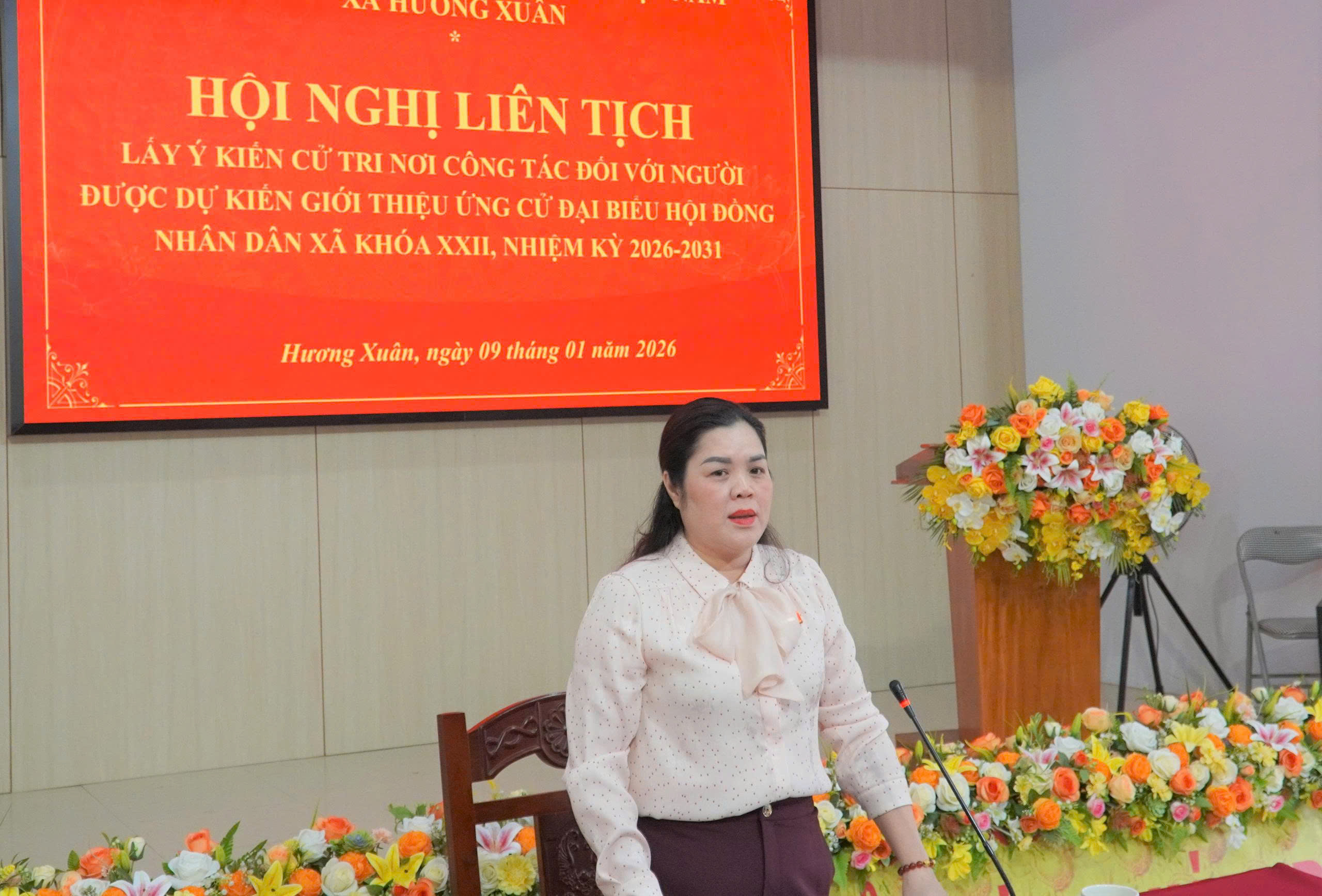 Chiều ngày 09/01/2026, xã Hương Xuân tổ chức Hội nghị liên tịch lấy ý kiến cử tri nơi công tác đối với những người dự kiến giới thiệu ứng cử đại biểu Hội đồng nhân dân xã khóa XXII, nhiệm kỳ 2026 – 2031.