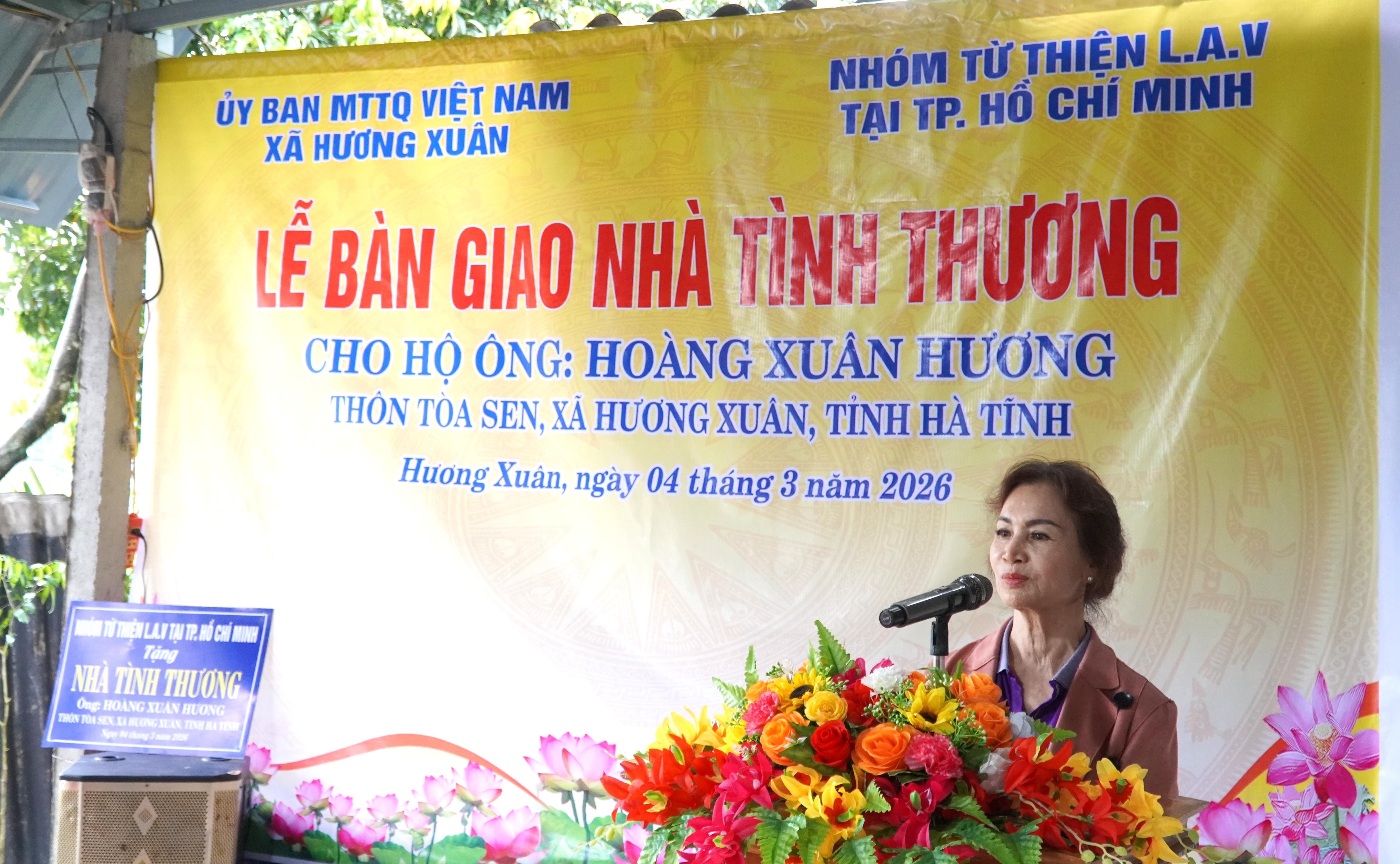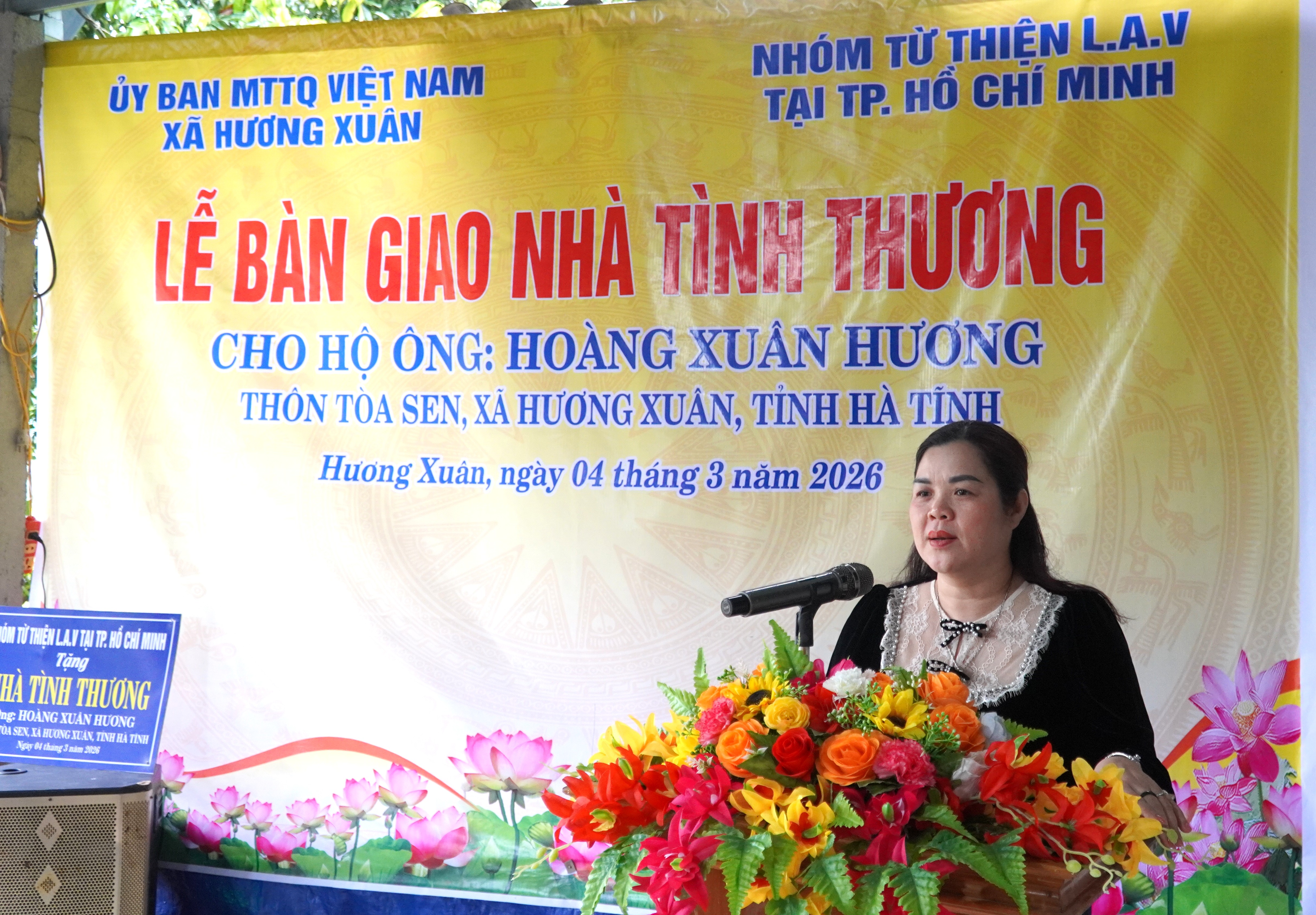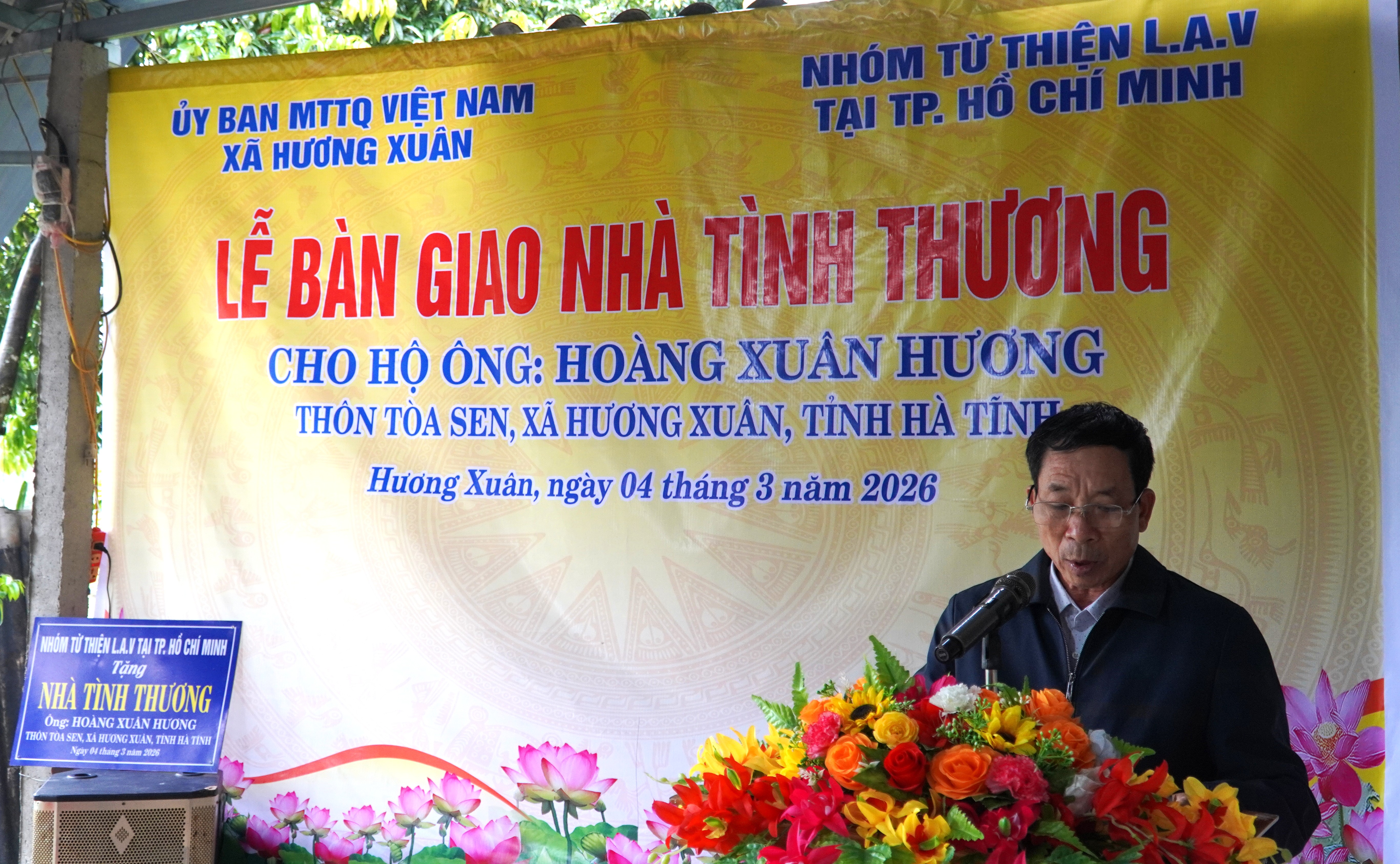 Chiều ngày 04/3/2026, Ban Thường trực Ủy ban MTTQ Việt Nam xã Hương Xuân phối hợp với Nhóm từ thiện L.A.V tại Thành phố Hồ Chí Minh tổ chức Lễ bàn giao nhà tình thương cho gia đình ông Hoàng Xuân Hương, thôn Tòa Sen, xã Hương Xuân, tỉnh Hà Tĩnh.